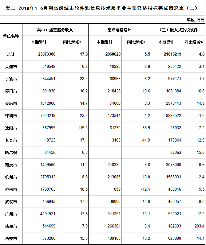 2018年1-6月副省级城市软件和信息技术服务业主要经济指标完成情况表(二)