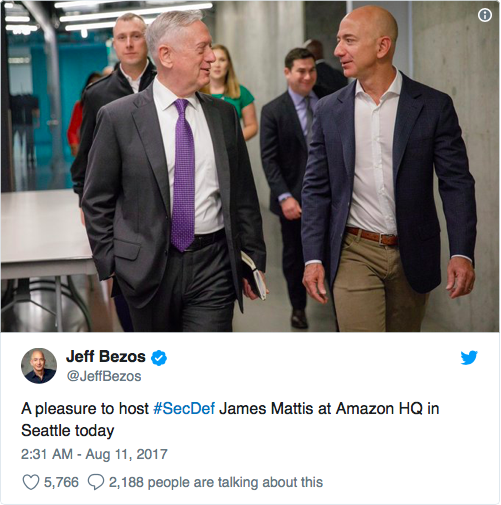 特朗普曾在 Twitter 上「攻击」贝佐斯旗下的《华盛顿邮报》捏造自己的假新闻。Vanity Fair 报道曾猜测,特朗普政府或许会因此介入亚马逊与五角大楼的合作,但五角大楼表示这项交易不会因白宫的施压而受到影响。美国国防部发言人帕特里克·埃文斯重申,「JEDI 合作是『透明的』,『完全公开的』,没有公司有特权,我们想为五角大楼选择最好的云计算解决方案。」
