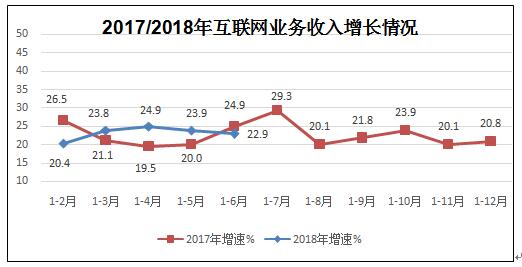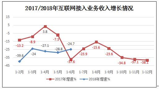 上半年,互联网企业完成互联网接入业务收入83.8亿元,同比下降24.7%,降幅较一季度收窄2.4个百分点。