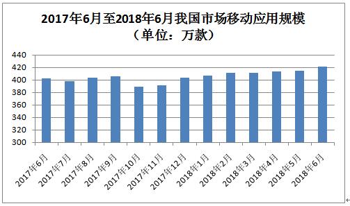 我国市场上移动互联网应用规模继续扩大。截至2018年6月底,我国市场上监测到的移动应用为421万款。6月份,我国第三方应用商店与苹果应用商店中新上架8.8万款移动应用。截至6月底,我国本土第三方应用商店移动应用数量超过240万款,苹果商店(中国区)移动应用数量超过181万款。