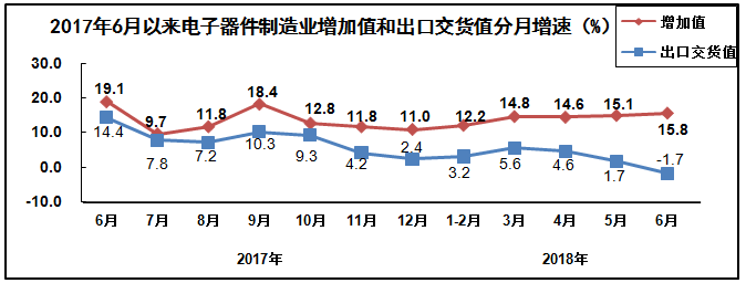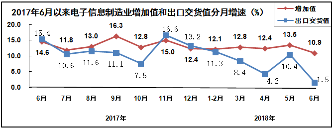 上半年,规模以上电子信息制造业实现出口交货值同比增长6.1%,增速同比回落7.3个百分点;6月份,电子信息制造业出口交货值仅增长1.5%。