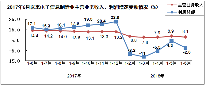 上半年,电子器件制造业主营业务收入同比增长6.9%,利润总额同比下降12.7%。