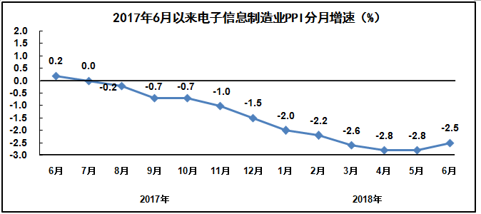 上半年,电子信息制造业生产者出厂价格同比下降2.5%。6月份,电子信息制造业生产者出厂价格同比下降2.5%,延续去年三季度以来的下降趋势,环比增长0.1%。