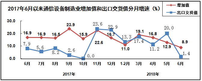 上半年,通信设备制造业增加值同比增长13.4%。出口交货值同比增长11.5%。主要产品中,手机产量同比增长3.4%;其中智能手机产量同比增长4.7%。