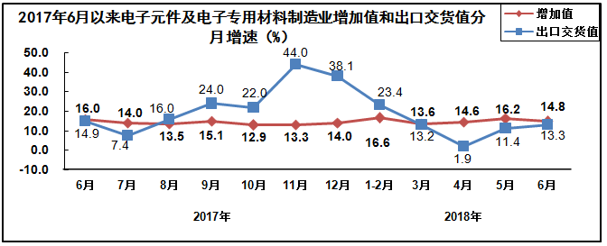上半年,电子元件及电子专用材料制造业增加值同比增长15.4%。出口交货值同比增长10.3%。主要产品中,电子元件产量同比增长21.5%。