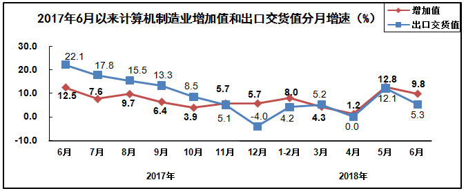 上半年,计算机制造业增加值同比增长7.6%。出口交货值同比增长5.6%。主要产品中,微型计算机设备产量同比增长0.5%,其中笔记本电脑产量同比增长1.7%;平板电脑产量同比下降3.2%。