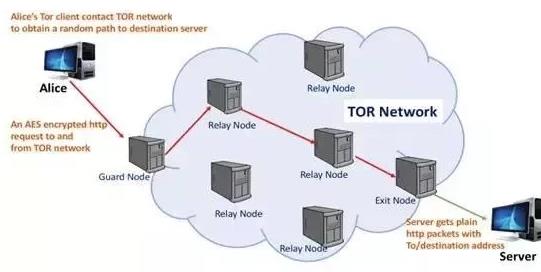 图3:Alice与目标服务器之间TOR通信的说明。通信开始于Alice向服务器请求一个地址。TOR网络给出AES加密的路径。路径的随机化发生在TOR网络内部。包的加密路径用红色显示。当到达TOR网络的出口节点时,将简单分组转发给服务器。出口节点是TOR网络的外围节点。