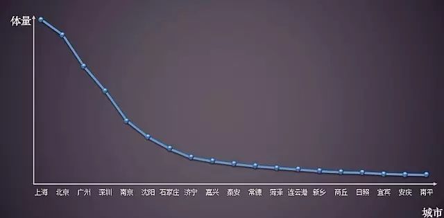 美团当时花了很长时间讨论这件事情,把这个想象成一个坐标,一个横轴一个纵轴,横轴是一个城市打一个点,纵轴是这个城市的体量。把体量最大的城市排在前面,体量最小的城市排在后面,画出一张图大概是下面这样一张图。