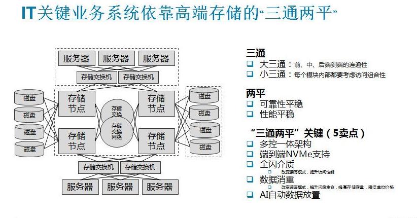 所以在IT关键业务系统里,首先我们要买高端存储,因为我们要可靠性、要稳定可预期的性能、要考虑到业务的灵活性。另外还要考虑三通两平,三通两平里除了我们已经熟知的多控一体的技术以外,现在我们还要考虑NVMe的支持、全闪存、数据消重和人工智能。