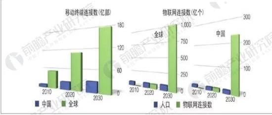 2010-2030年全球和中国移动终端及物联网连接数增长趋势