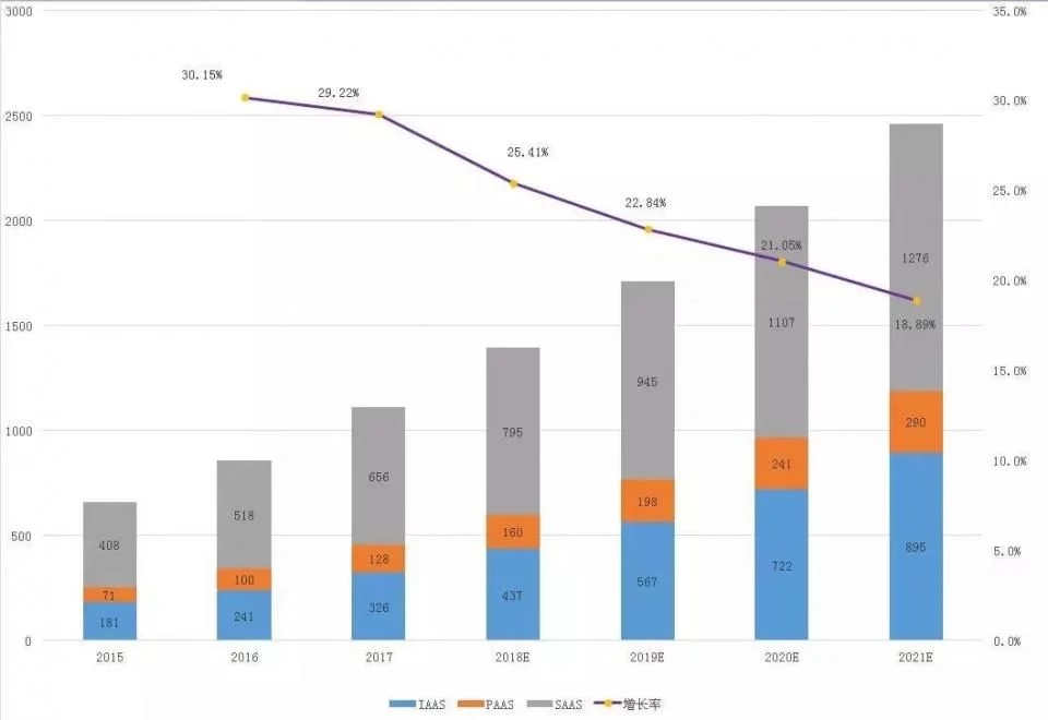 来自市场咨询公司Gartner的研究表明,从2016年到2021年,全球云市场的增长率呈现出逐年降低的趋势,将从2016年的30.15%降低到2021年的18.89%。
