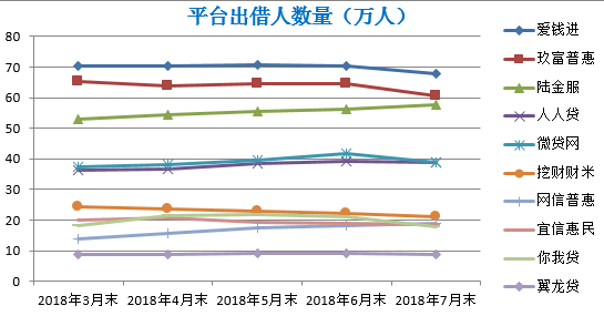 如下图所示,2018年6月末,10家大平台(在接入互金协会信息披露系统的平台中,随机选择体量较大的10家)的月末出借人数量环比增加1.73万人,可以视为爆雷初期大平台还能享受到行业分化的红利。而截至2018年7月末,10家平台的月末出借人数量环比减少12.4万人,除了陆金服和网信普惠仍保持增长外,其他8家平台均有不同幅度的下降。
