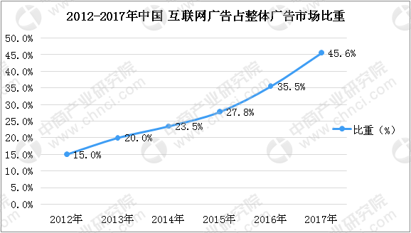 2012-2017年互联网广告占广告市场比重持续增长,数据显示,2012年中国互联网广告占广告市场的15%,到2017年占比为45.6%,随着人们获取信息渠道逐渐网络化,互联网广告渠道的多元化,未来互联网广告市场将持续稳定增长。