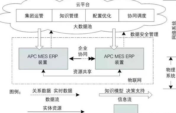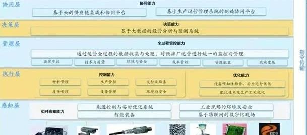(2)执行层 通过智能生产控制系统全面管控从材料管理、生产调度、生产控制、质量管理、设备与安全管理、交付与服务各个环节,并随时对生产设备的运行和生产工艺进行优化。