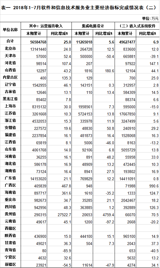2018年1-7月软件和信息技术服务业主要经济指标完成情况表(二)