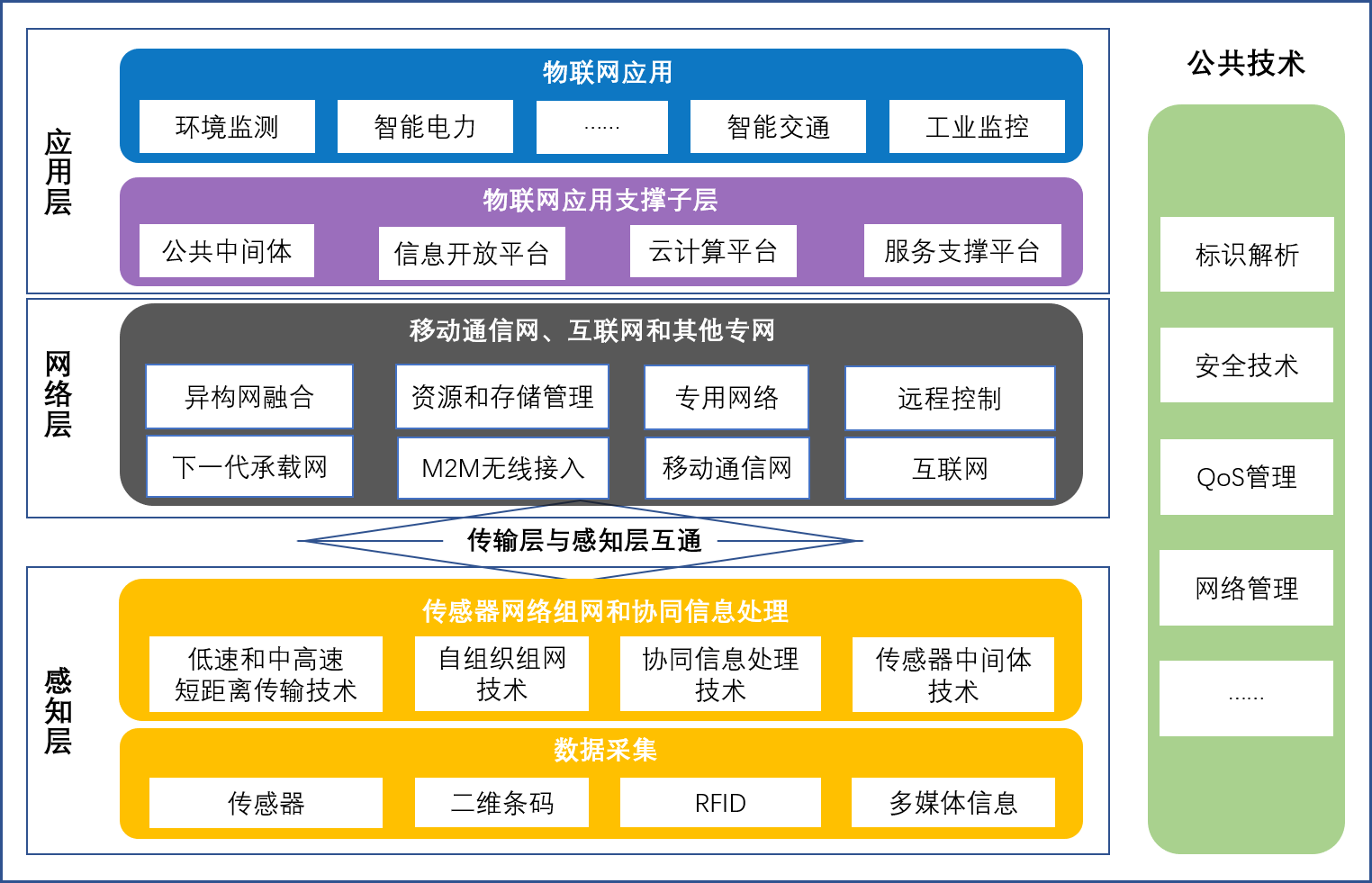 此外,围绕物联网的三个逻辑层,还存在一个公共技术层。公共技术层包括标识与解析、安全技术、网络管理和服务质量(QoS)管理等具有普遍意义的技术,它们被同时应用在物联网技术架构的其它三个层次。
