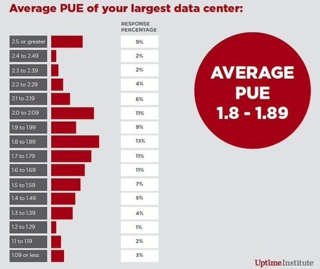 而根据2012年Uptime Institute对各家企业最大数据中心的调查,该PUE值在 1.8-1.89 左右,我国在《"十三五"国家信息化规划》中,要求2018年新建云计算数据中心PUE值不得高于1.5,2020年新建云计算数据中心PUE值不得高于1.4。