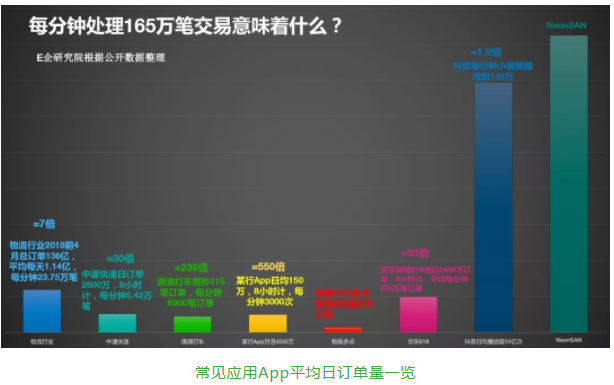 每分钟165万事务处理量意味着什么?E企研究院收集了目前较为热门的相关行业或新秀公司,根据其公开资料/数据整理,以与NeonSAN的Oracle RAC数据库性能对比,具体如下图所示: