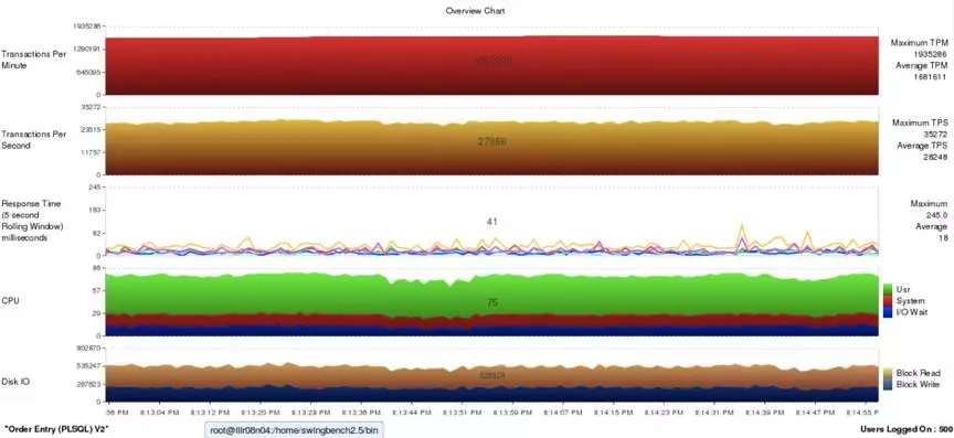 通过监控画面可以看到,Oracle服务器的CPU平均利用率已经超过75%。结合以往E企研究院的测试经验来看,通常情况下,服务器CPU利用率超过70%就意味着已经达到最佳计算性能,即使再增加负载,CPU占用率可能会进一步提升,但就应用来看,其性能并没有增加,反而延迟可能会出现不利影响。因此,从测试结果来看,在配备3个NeonSAN卷做Oracle数据库存储时,整个Oracle RAC环境就已经达到最高性能,而在此环境中,Oracle服务器配备的是Intel Xeon E5-2698 v4处理器,要提升计算性能就只能更换到最新一代XeonSP系列中的顶级处理器,或者使用配备更多CPU的四路及以上服务器。