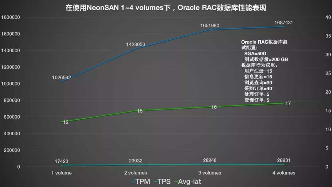 在Oracle RAC数据库测试中,在配置3个卷作为Oracle数据库存储时,获得超过165万TPM(TransactionsPer Minute,每分钟事务处理数),但再增加一个NeonSAN存储卷,数据库性能并没有增加,这意味着在3个NeonSAN卷时,Oracle RAC应用的其他子系统已经出现瓶颈,导致尽管存储性能增加,但应用性能并没有增加。结合上一个测试结果,此时瓶颈可能出现在计算方面,即Oracle数据库服务器的计算能力达到瓶颈。
