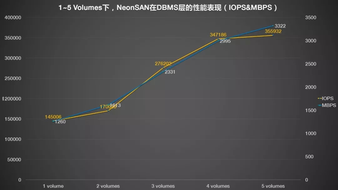 与之前基准性能测试不同的是,这一项测试是基于RDBMS层的测试,其通过模拟Oracle数据库的数据访问特点来对后端NeonSAN存储进行评估。上图显示在配置4个NeonSAN存储卷后获得最大接近35万IOPS,然后即使再添加NeonSAN存储,其性能几乎不变。而且顺序带宽则在5个NeonSAN卷时获得最高3.3GB/s吞吐量。