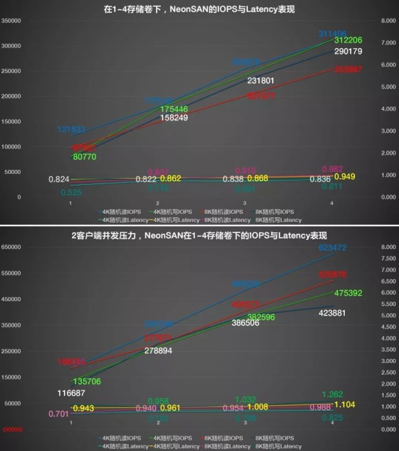 在单个压力客户端(图上)和2个压力客户端(图下)测试环境中,QingStor NeonSAN分别供应多个(1~4个)存储卷下的性能(IOPS)和响应时间(Latency,ms)表现。