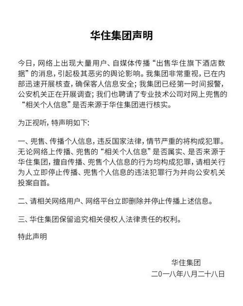 8月28 日上午,暗网中文论坛中出现一个帖子,声称售卖华住旗下所有酒店数据,汉庭酒店、美爵、禧玥、漫心、诺富特、美居、CitiGo、桔子、全季、星程、宜必思、怡莱、海友等多家酒店都包含在内。