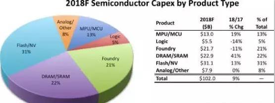 如下图所示,超过一半的行业资本支出预计用于内存生产——主要是DRAM和闪存,这些支出包括了对现有晶圆厂线和全新制造设施的升级。总的来说,预计今年内存将占到半导体资本支出的53%。