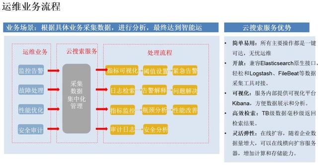 继续细化,从运维的业务层面看,在云搜索服务上,日志分析能完成监控告警、故障处理、性能优化和安全审计等事项,最终达到智能运维的目标。基本思路是收集相关日志数据,导入到云搜索服务中,使用搜索语句获得结果,最终在可视化界面呈现。而云搜索服务是基于Elasticsearch,具有高效检索和灵活弹性的优势,拥有可视化工具,能帮助运维人员集中化管理日志数据,高效完成运维任务。