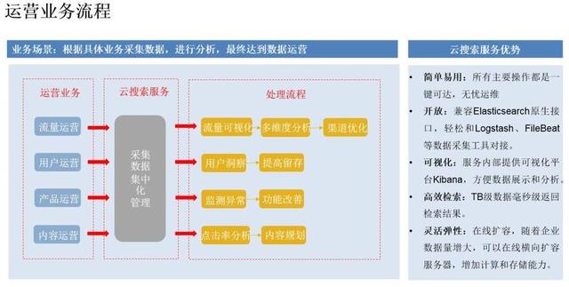 而在运营业务层面,云搜索服务能帮助运营人员进行数字化运营,包括但不仅限于流量运营,用户运营,产品运营和内容运营。基本流程与运维相似,收集重要指标,导入到云搜索服务,建立图表,进行后续业务分析。