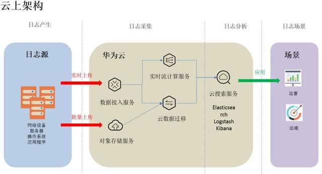 从技术上,整体云上架构如下,包括日志产生,日志采集,日志分析和日志场景。