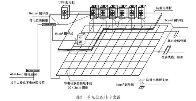 本项目机房采用SM混合型等电位联合接地方式,一是在机房地板下设置若干等电位联接端子箱,并与地下一层总等电位节点(大楼联合接地排)相连,它是通过采用40×4mm镀锌扁钢从弱电井引接。二是铺设用30×3mm铜排构成等电位联接接地干线,间距1200×1200mm,呈网状结构,并与等电位联接端子箱相连,形成机房等地位连接接地整体,详见图2。