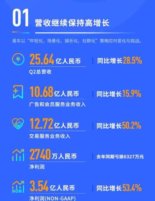 近日,中国领先的汽车互联网企业易车发布了Q2财报。报告显示,2018年Q2营收人民币25.64亿元(约3.88亿美元),同比增长28.5%。Q2净利润为人民币2,740万元(约410万美元);不按美国通用会计准则(Non-GAAP)计,2018年第二季度净利润为人民币3.54亿元(约5,350万美元),同比增长53.4%,表现出强劲的增长势头。