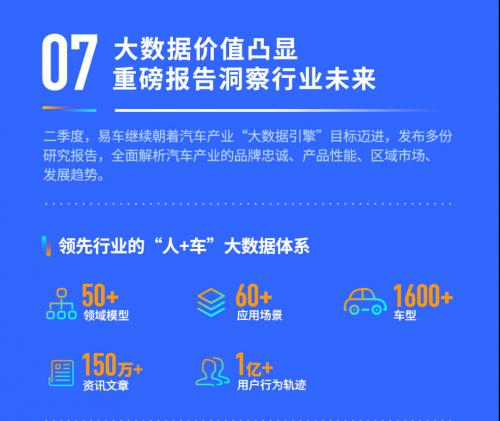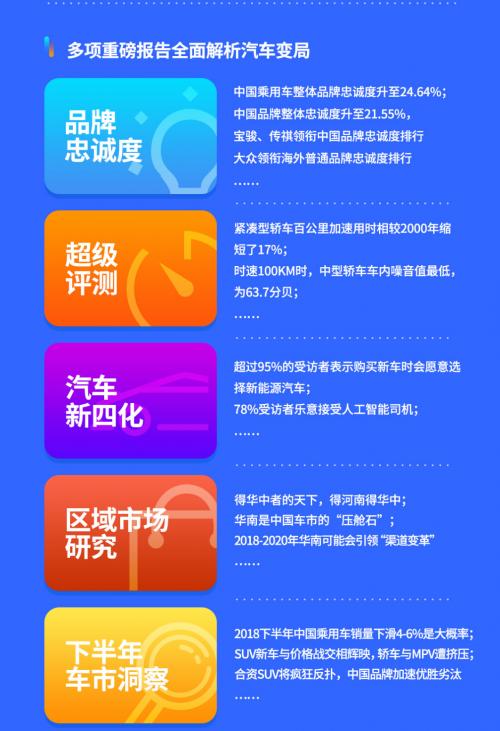 第二大亮点是发布多份重镑研究报告,全面解析行业变局和发展趋势。易车二季度先后发布《2018中国轿车市场洞察报告》、《中国消费者心目中的汽车"四化"系列调查》、《中国乘用车品牌忠诚度报告》、《2018下半年乘用车市场洞察报告》等重量级研究,分析中国车市产品迭代、区域市场、销售预期、新四化转型热点与痛点,为汽车产业提供了参考。