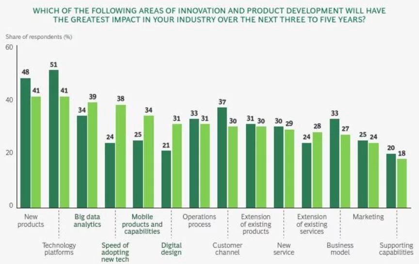 根据波士顿公司《2018年全球最具创新力企业》报告,自2014年以来,越来越多的公司正在把大数据分析应用在新产品的功能实现和数字营销上,大数据分析的重要性也从第8位上升至第3位。超过一半的受访者表示,他们的公司使用数据分析来实现与创新有关的各种目的,包括识别新领域、为构思创意提供投入、揭示市场趋势、为创新投资决策提供信息以及设定投资组合优先事项等等。