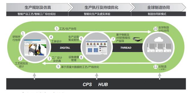 卓越制造的业务模式包括生产规划及仿真、生产执行及持续优化、全球制造协同三个核心业务,如图所示。其与创新研发类似,同样需要基于统一的CPS HUB 提供数据基础,如设计数据、工艺工装数据、生产质量数据、设备运营数据等。