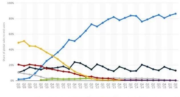 在2016上半年,数据显示安卓操作系统占有全球移动智能手机系统86.2%的市场份额