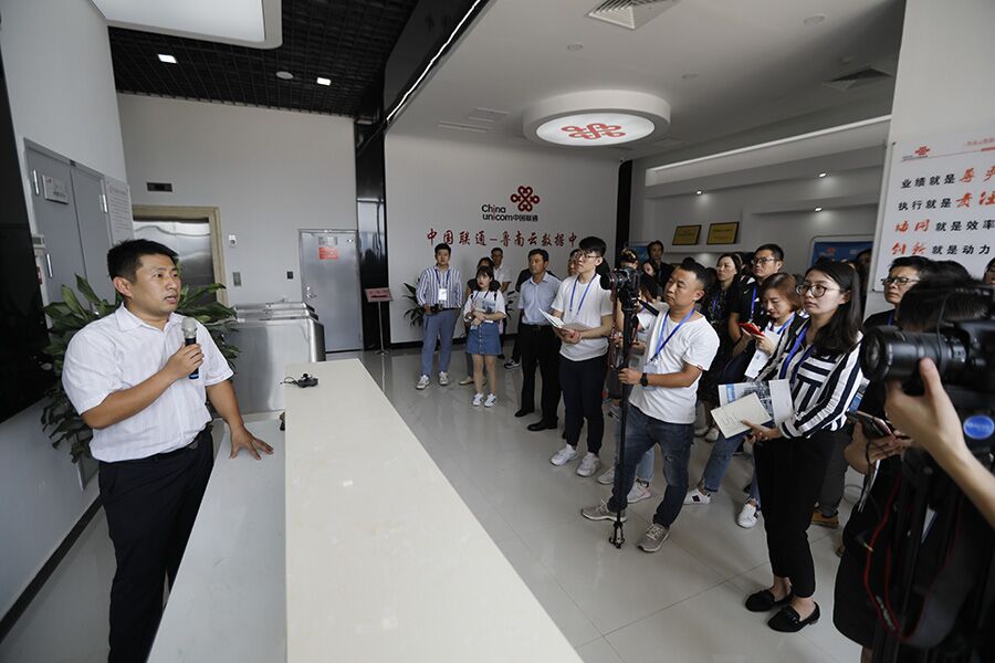 鲁南大数据中心有关负责人向采访团介绍中心情况。