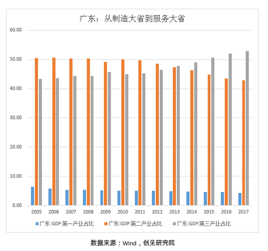 比起做大,浑身流淌民营创新精神的广东企业更愿意做强:早在2013年,广东第三产业占比就已反超第二产业。在由制造大省转型为服务大省,不断追求高附加值的过程中,劳动密集型的传统制造业经历了第一轮迭代。