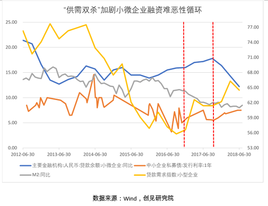 从需求角度看,早在2016年以来M2的开始快速下行时,小型企业贷款需求就经历了一波触底反弹,好在彼时小微企业贷款余额仍能稳健增长;而当M2进入个位数区间,以中小企业私募债为代表的小微企业融资成本再度上行,小型企业贷款需求急升至近3年高位,然而此刻银行对“后进生”们却选择了闭门谢客——“供需双杀”加剧了本轮小微企业融资难的恶性循环,不但涉及国民经济、更关乎国计民生的小微企业问题若再不引起关注,将可能引发极具传染性的系统性危机。
