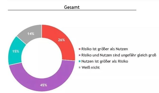 德国人一向对工业、进步、科技抱有谨慎和怀疑的态度,人工智能也没能逃脱这样的命运。他们的担忧,远远超过马斯克的程度。根据YouGov的一项调查,45%的受访德国人认为人工智能利益与风险相当,26%的人认为风险高于利益,只有15%的人认为利益更多。受访者年龄越大,他对人工智能持批判态度的可能性就更高。
