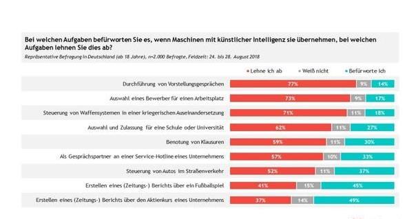 对于德国人来说,人工智能更应该被应用在哪些领域呢?从整体情况来看,德国人拒绝将人工智能用于“评价他人”。77%的受访者表示,自己更愿意与人类面对面;73%的倾向于拒绝通过机器来进行员工招聘,尽管他们也承认面试官在选人用人时很难做到完全客观。在战争和武器方面,德国人也拒绝人工智能的介入。71%的受访者表示,用人工智能操控武器实在是不堪设想。