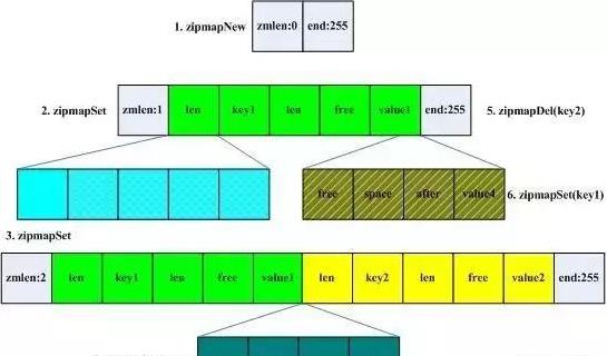 可以看出,这个结构中初始情况只有2个字节,随着操作的增加它会变长,其中最关键的是一个关于Free这个字段的理解,以Map为例,如果新插入一个Key,那么对应ZipMap就会多出来一长串数据:<len><key><len><free><value>。从图中可以看到插入key1的时候只有绿色的一串,当key2插入的时候就会又出来一个类似的黄色结构串。free的功能是在插入的时候用来冗余空间的,当key所对应的数值发生变化的时候,如果数据变的比之前短了,那么free的长度就变大,这个时候不需要做ZipMap的resize操作,如果数据长度变长了,并且在free能够足以支持新数据的范围之内,那么free就被利用起来,并且也不需要做Resize。这个时候会有空间的浪费或者说碎片。空间换时间,没什么好说的。当然Redis的代码中还有另外一个参数ZIPMAP_VALUE_MAX_FREE,这个参数可以用来设置如果Free的大小超过了这个值,那么ZipMap会发生Resize(收缩),从而节约空间