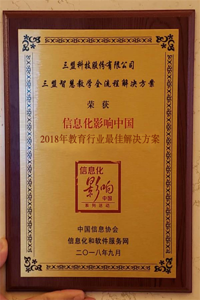2018年9月20日,由中国信息协会主办,信息化和软件服务网和中国信息协会传媒中心协办的“2018中国信息化创新发展大会在北京举行。三盟科技凭借在智慧教学领域的杰出地位,应邀出席了本次大会,其三盟智慧教学全流程解决方案在“信息化影响中国·2018奖项评选活动”中斩获“2018教育行业最佳解决方案”大奖。