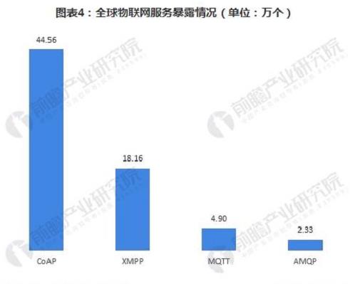 此外,全球范围内采用CoAP、XMPP协议的云服务端暴露数量较高。具体来说,全球暴露数量最多的是CoAP服务,数量接近45万个;其次是XMPP,暴露数量也超过18万个。