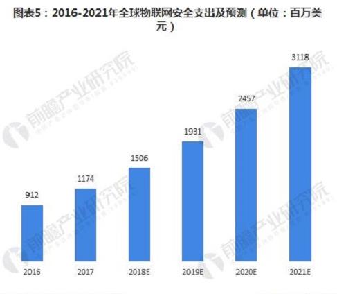 图表5:2016-2021年全球物联网安全支出及预测(单位:百万美元)