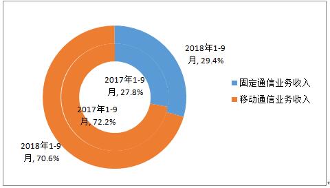 固定通信业务收入占比小幅提升。前三季度,三家基础电信企业实现固定通信业务收入2918亿元,同比增长8.9%;实现移动通信业务收入6997亿元,同比增长0.8%,占电信业务收入的70.6%。