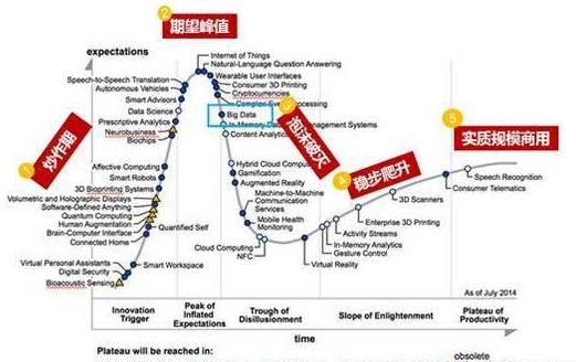 如图1蓝色方框是大数据,经过前两年的炒作,大数据产业开始发现并面临一个个现实问题,只有解决了这些问题,才能真正推动大数据产业进步。值得注意的是,这个Hype曲线是Gartner2016年公布的,2017年Hype曲线并没有大数据产业,因为Gartner觉得大数据并非是新兴技术。因此现在2018年,大数据产业的实际位置应该相比上图再稍微下移一些。