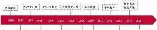 在PC互联网时代,出现了以Yahoo为代表的搜索引擎,以QQ为代表的在线社交软件,以阿里巴巴为代表的电子商务,网络游戏亦进入大型网游时代;