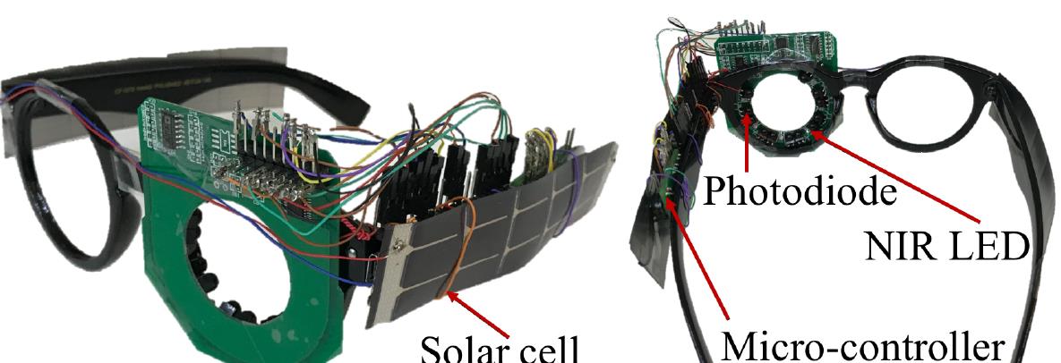 研究人员使用现成的硬件组件构建了一个原型,并将其集成到一副普通的眼镜中。针对22名被试的实验表明,系统在追踪瞳孔位置方面的平均误差为0.8mm,在120Hz输出帧速率下追踪瞳孔直径时的平均误差为0.3mm,平均功率为395μW(由镜臂的两个太阳能电池功能)。